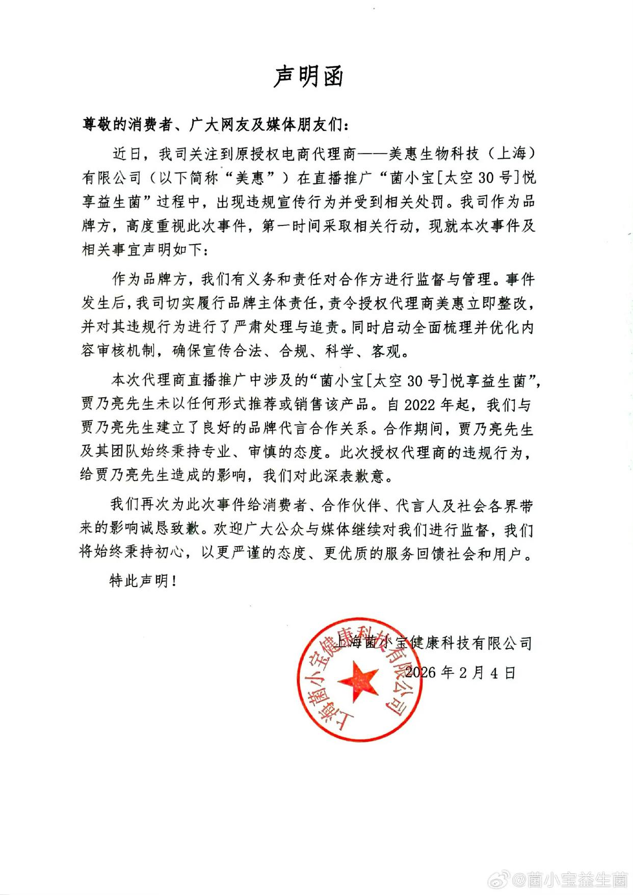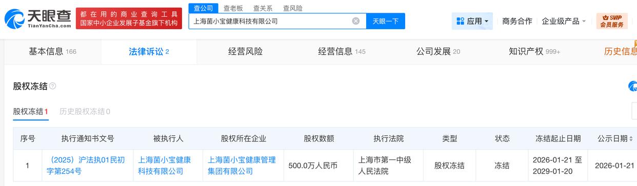 近期,南都N视频记者从天眼查平台获悉,演员贾乃亮代言的益生菌品牌“菌小宝”背后运营主体上海菌小宝健康科技有限公司新增一则股权冻结信息,涉及冻结数额500万元人民币,冻结期限长达3年,冻结日期为2026年1月21日至2029年1月20日,执行法院为上海市第一中级人民法院。