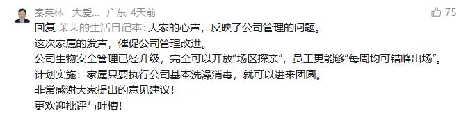 不过,在上述文章引起热议后,秦英林近日再次在评论区留言表示,“这次家属的发声,催促公司管理改进。公司生物安全管理已经升级,完全可以开放‘场区探亲’——家属只要执行公司基本洗澡、消毒就可以进来团圆,员工更能够‘每周均可错峰出场’。”
