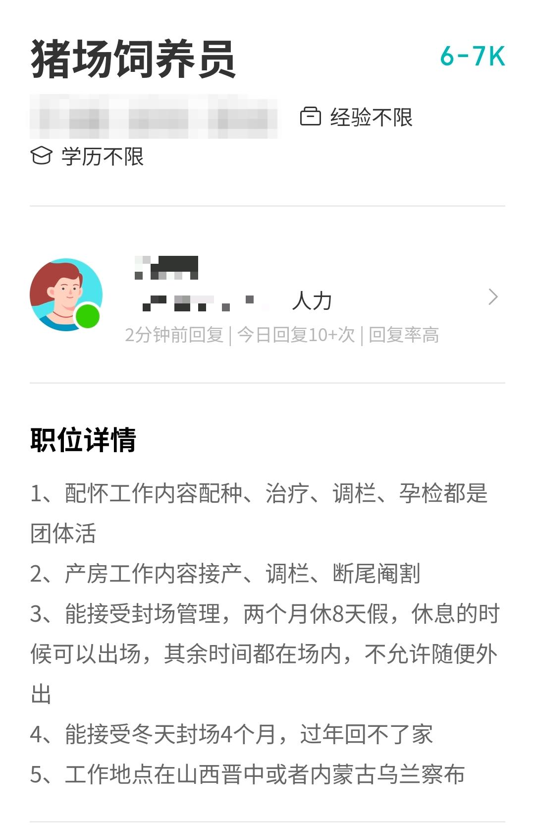 以某家公司的猪场饲养员岗位为例,其薪资范围为6000元至7000元,要求能接受封场管理,两个月休8天,休息时可以出场,其余时间都在场内(不允许随便外出),且要求能接受冬天封场4个月,过年无法回家。