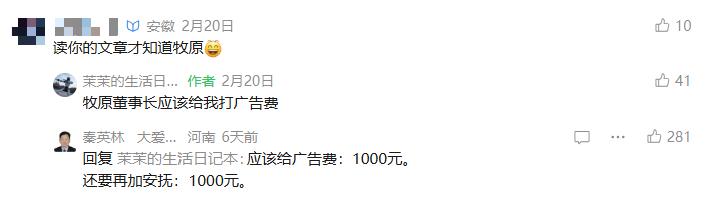 不过,有网友在这篇文章的评论区留言称,“读你的文章才知道牧原。”博主则回复称,“牧原董事长应该给我打广告费。”