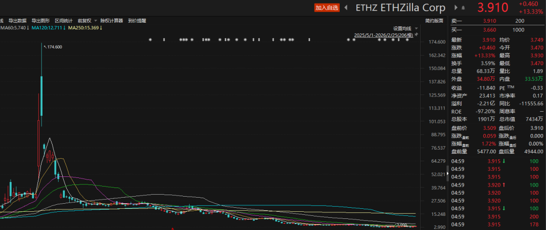值得一提的是,根据美国13F文件,彼得·蒂尔旗下风投公司Founders Fund在去年四季度同步清仓了其持有的7.5% ETHZilla股份。ETHZilla原为一家生物科技公司,后转型为加密货币储备公司。蒂尔的退出正值ETHZilla股价暴跌之际。自去年8月达到峰值以来,ETHZilla股价已下跌约98%。