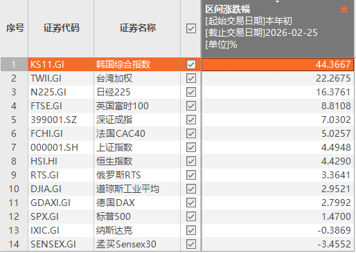 年初至今,美股三大指数在全球重要市场指数中表现落后。Choice数据显示,截至2月25日,道琼斯工业平均指数、标普500指数和纳斯达克指数今年以来涨幅分别为2.95%、1.47%、-0.39%,显著落后于其他市场。