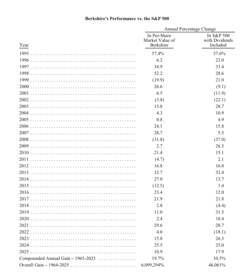 资本市场表现上,2025年伯克希尔·哈撒韦A类股涨幅为10.9%,落后于标普500指数17.9%(包括股息)的涨幅,但巴菲特执掌公司期间为股东创造了无可比拟的财富价值。新任CEO格雷格·阿贝尔在其首份致股东年度信中指出,自1965年以来,伯克希尔·哈撒韦的复合年增长率达19.7%,几乎是同期标普500指数复合增长率的两倍;该时间段内公司整体涨幅超6099294%,而标普500指数包括股息在内的涨幅仅为46061%。