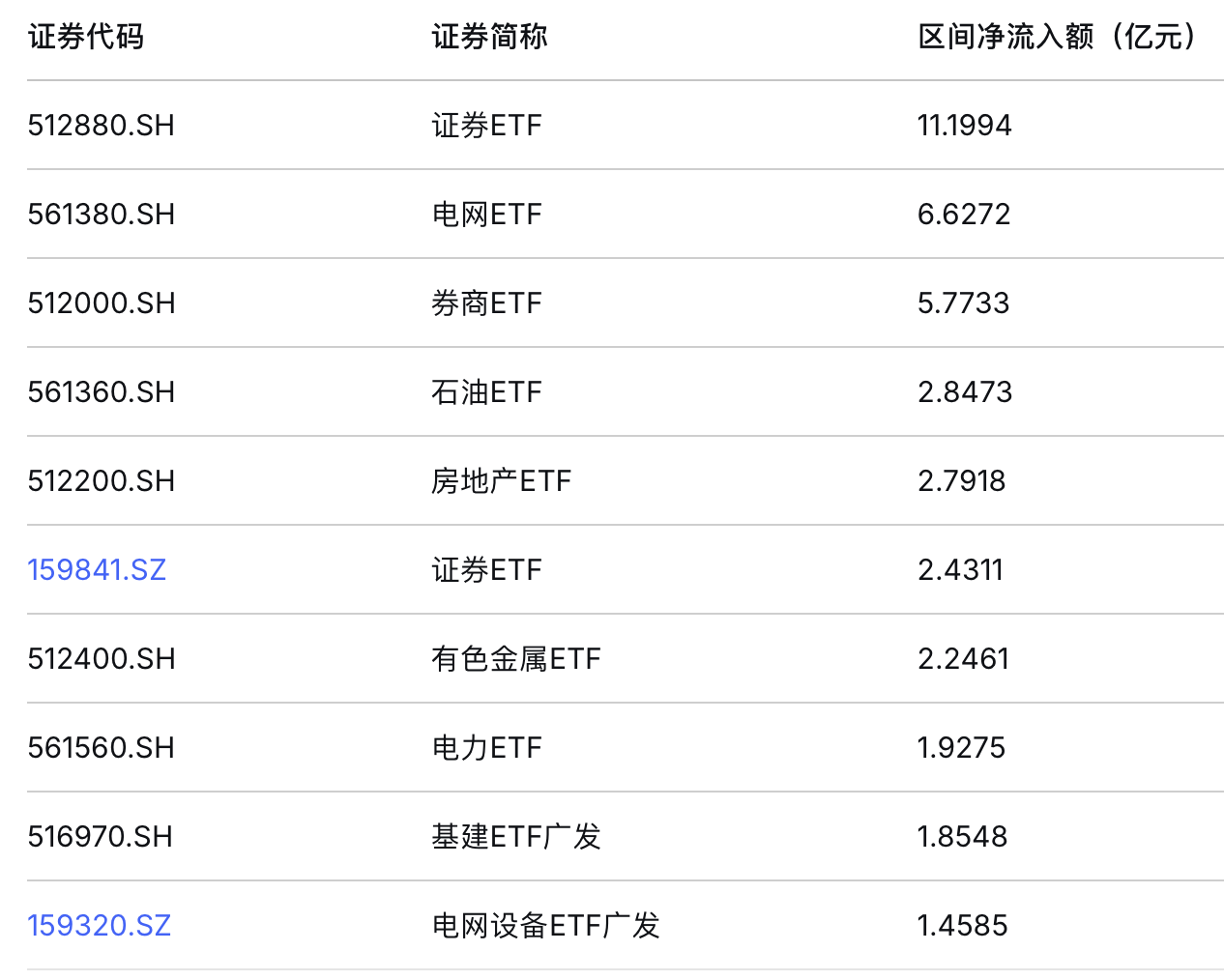 其中,除了华夏电网设备ETF,国泰证券ETF、永赢卫星ETF的净流入规模相对较大,分别为11.20亿元、8.82亿元。