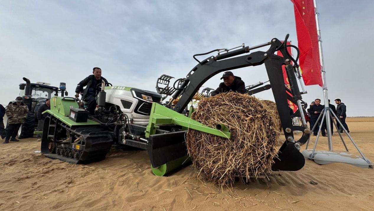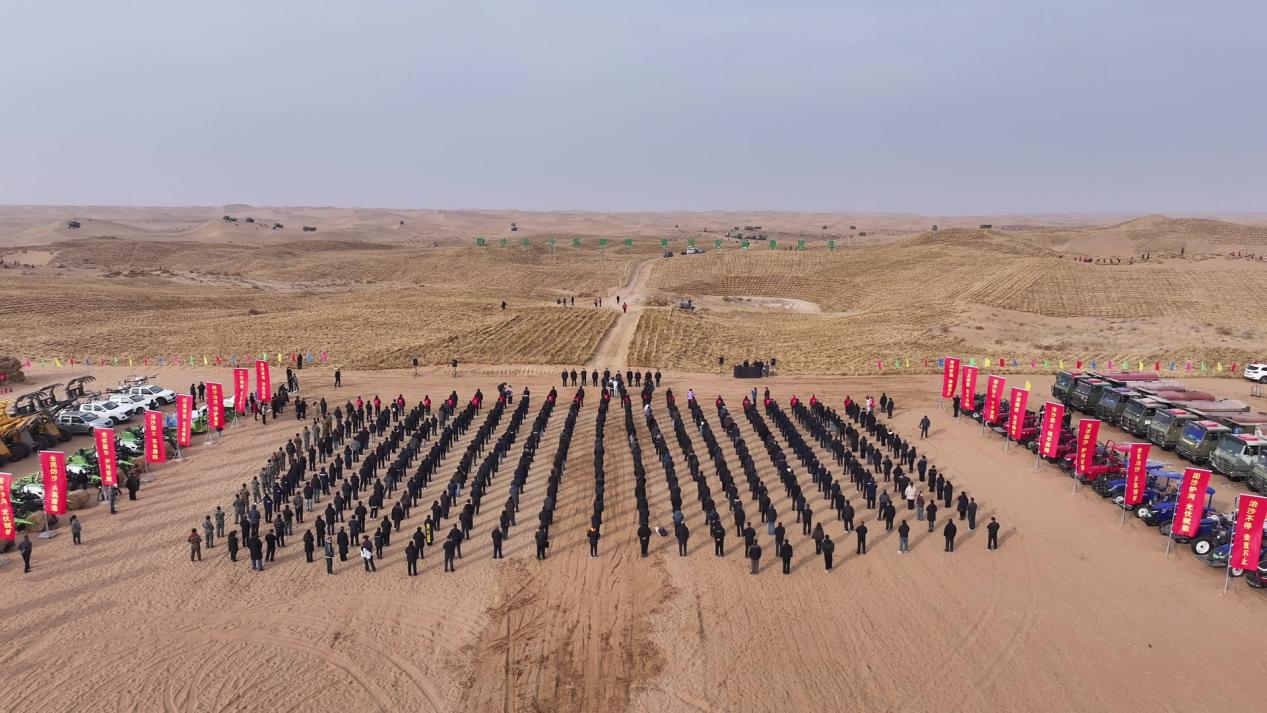 上午九时许,随着一声开工号令,寂静的沙漠瞬间沸腾起来。手扶式沙障机精准穿梭,在流沙上织出规整的草方格;无人机吊运草料,来回翻越沙丘沟壑;打桩机铿锵作响,将希望一根根夯进大地。机械的轰鸣声、人们的吆喝声,交织成一曲向沙漠进军的交响。这标志着“三北”工程六期重点项目——沿黄光伏治沙锁边带在阿拉善盟全面启动,也宣告着全盟“十五五”生态建设攻坚战正式打响。