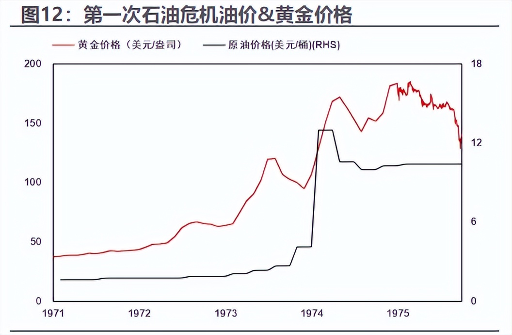 天风证券复盘指出,1973年10月第四次中东战争爆发,OPEC宣布石油禁运,国际油价从每桶2.5美元左右跃升至近12美元,美国经济开始走入“滞胀”——通胀率飙升,GDP转负陷入衰退。这一阶段,黄金的“抗通胀属性”和“避险属性”引发资金簇拥,价格大涨,从1971年布雷顿森林体系解体后的自由浮动价,到1974年末已涨至180美元/盎司左右。
