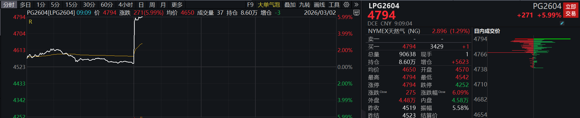 09:09 液化石油气(LPG)主力合约触及涨停,涨幅5.99%,报4794元/吨。