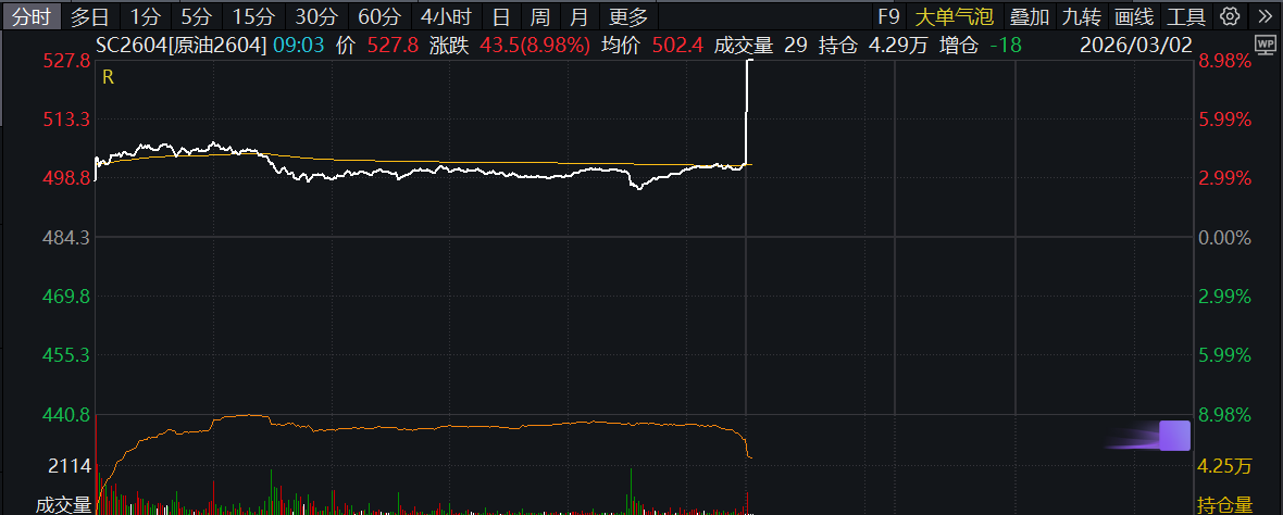 09:02 商品期货开盘,燃料油、LU燃油、原油主力合约涨停。沪银涨超8%,甲醇涨超7%,沥青、沪锡、液化气涨超5%,沪金、塑料涨超3%。