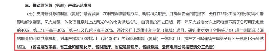 具体来看,措施明确,推动绿色氢(氨醇)产业示范发展。支持新能源和制氢(氨醇)融合发展。在制定配套管理办法、明确相关职责,并确保安全的前提下,允许在非化工园区建设可再生能源电解水制氢。风光制氢一体化项目原则上按风光6:4的比例谋划推动,自项目投产之日起,第一年风光发电允许上网电量不高于总可用发电量的40%,第二年不高于30%,第三年及以后不高于20%。通过公用电网供电的制氢(氨醇)项目,研究建立发电企业减少弃电量与制氢环节消纳电量的利益共享机制。对年产绿氢100吨以上(含100吨)的新能源制氢(氨醇)一体化项目,投产之日起连续三年给予每公斤最高13元补贴奖励。