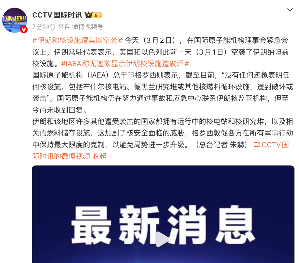 据@CCTV国际时讯,今天(3月2日),在国际原子能机构理事会紧急会议上,伊朗常驻代表表示,美国和以色列此前一天(3月1日)空袭了伊朗纳坦兹核设施。
