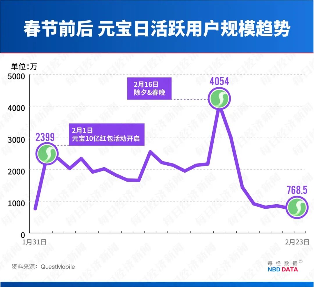 活动首日,元宝App日活达到2399万,较前一日(1月31日)增长2.1倍。除夕(2月16日)当天,元宝App的日活更是较前一天的2175万翻倍至4054万。