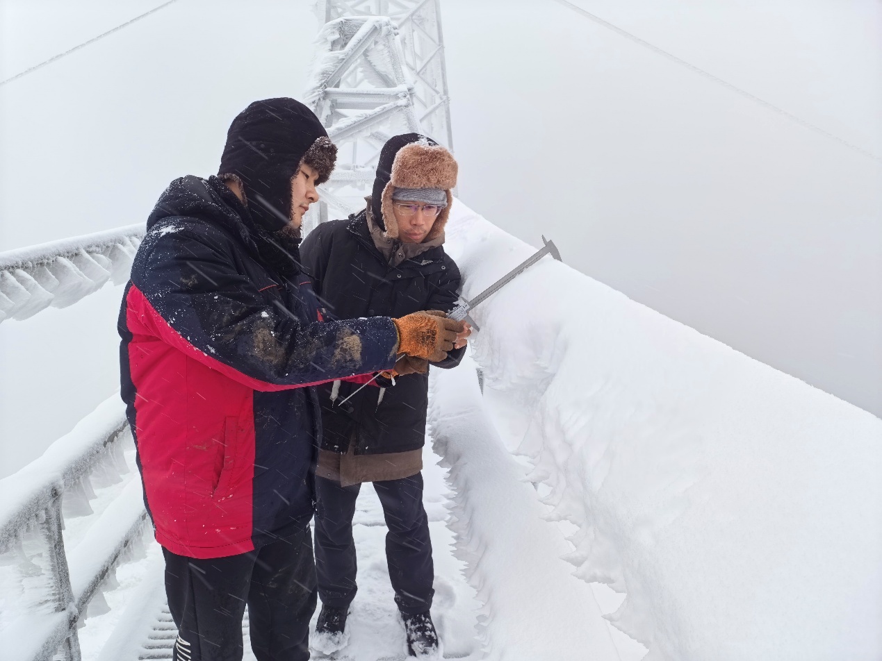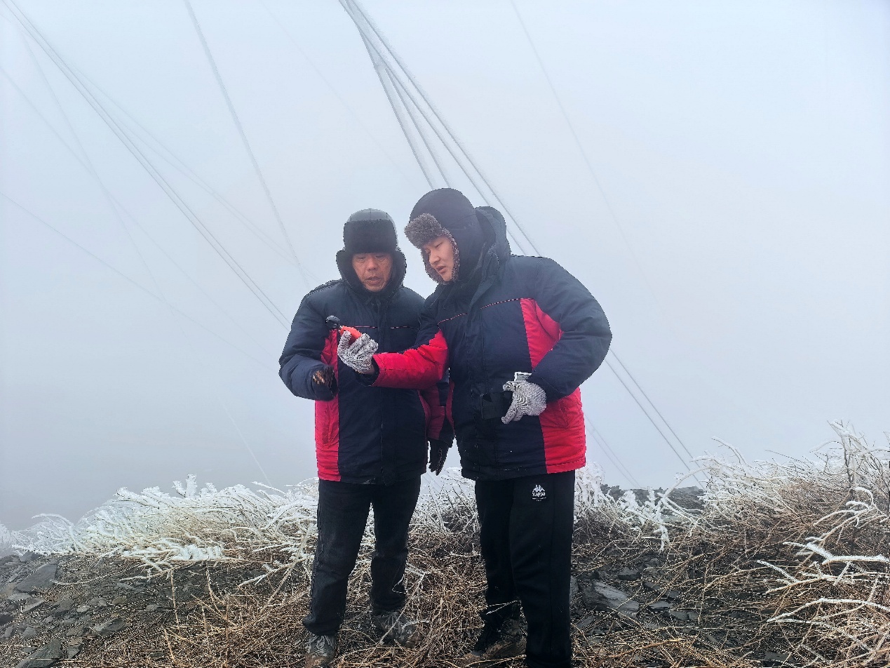 抵达现场后,零下1摄氏度的低温、20米每秒的狂风裹挟着湿冷雾气,让观冰站成为覆冰“重灾区”。“站在雨凇塔上十来分钟,身上就被雾气打湿,再站一会儿都要和导线一起结冰了”解博飞的话,道出了现场作业的艰辛。此时金古线导线覆冰厚度已逼近预警值,三名队员毫无迟疑,立即登上观测塔配合省电科院工作人员李劲松开展作业,李劲松手持卡尺精准测量覆冰厚度,解博飞紧握锯条小心翼翼截取冰样,相宇忠和焦瑞浩细致完成冰样称重,四人密切配合,运用模拟导线称重法、排液法分别实测等值冰厚和覆冰密度,历经近2小时奋战,一组组精准数据被火速传回指挥中心,为融冰作业提供了关键科学依据。