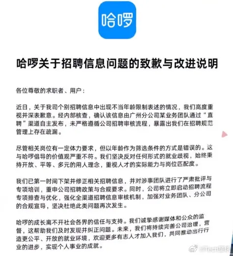 3月3日,哈啰招聘发布致歉声明,表示个别招聘信息中出现不当年龄限制表述的情况,高度重视并深表歉意。