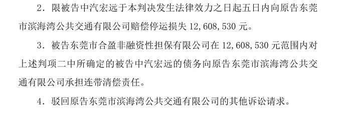 但在双方争议的核心——经济赔偿方面,判决结果与原告的预期相去甚远。判决书显示,中汽宏远需向东莞巴士赔偿停运损失1900.4万元,向东莞城巴赔偿3283.1万元,向滨海湾公交赔偿1260.85万元,三案合计判赔金额约为6444.35万元,仅占原告诉求总额5.5亿元的11.6%。
