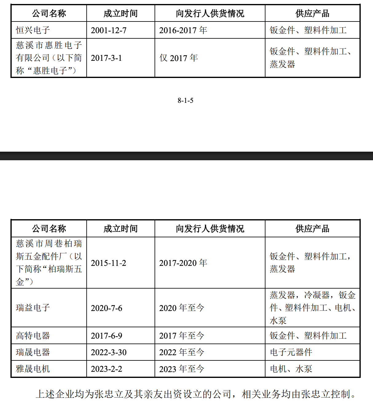 瑞益电子成立于2020年7月6日,成立当月便与惠康科技达成合作,短短数年便成长为年采购额超4亿元的核心供应商。惠康科技解释称,合作系承接自瑞益电子的三家“前身”企业,但梳理发现,包括瑞益电子及其关联方、前身企业在内,先后有7个主体接力向惠康科技供货,包括恒兴电子、柏瑞斯五金、惠胜电子、瑞益电子、高特电器、瑞晟电器、雅晟电机,且均由张忠立及其亲友控制。