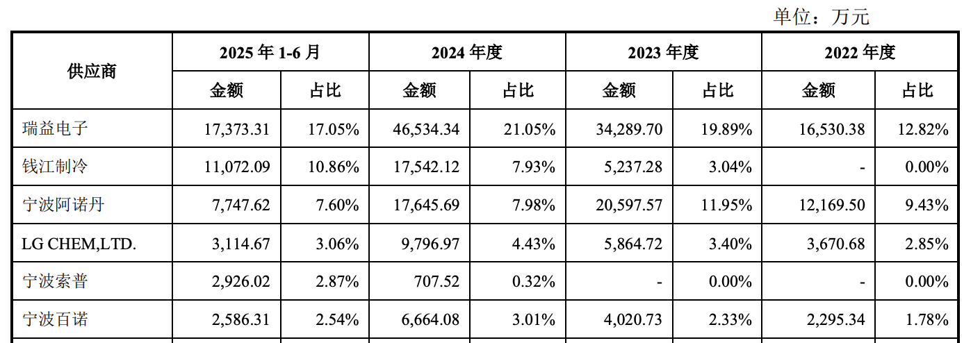 真正让惠康科技IPO按下“暂停键”的,是其与主要供应商之间远超正常供采关系的诸多疑点,这也是监管层反复追问的核心焦点。过去数年,公司最大供应商均为慈溪瑞益电子有限公司(下称“瑞益电子”),2025年1-6月份采购金额达1.73亿元,占总采购额比重为17.05%。
