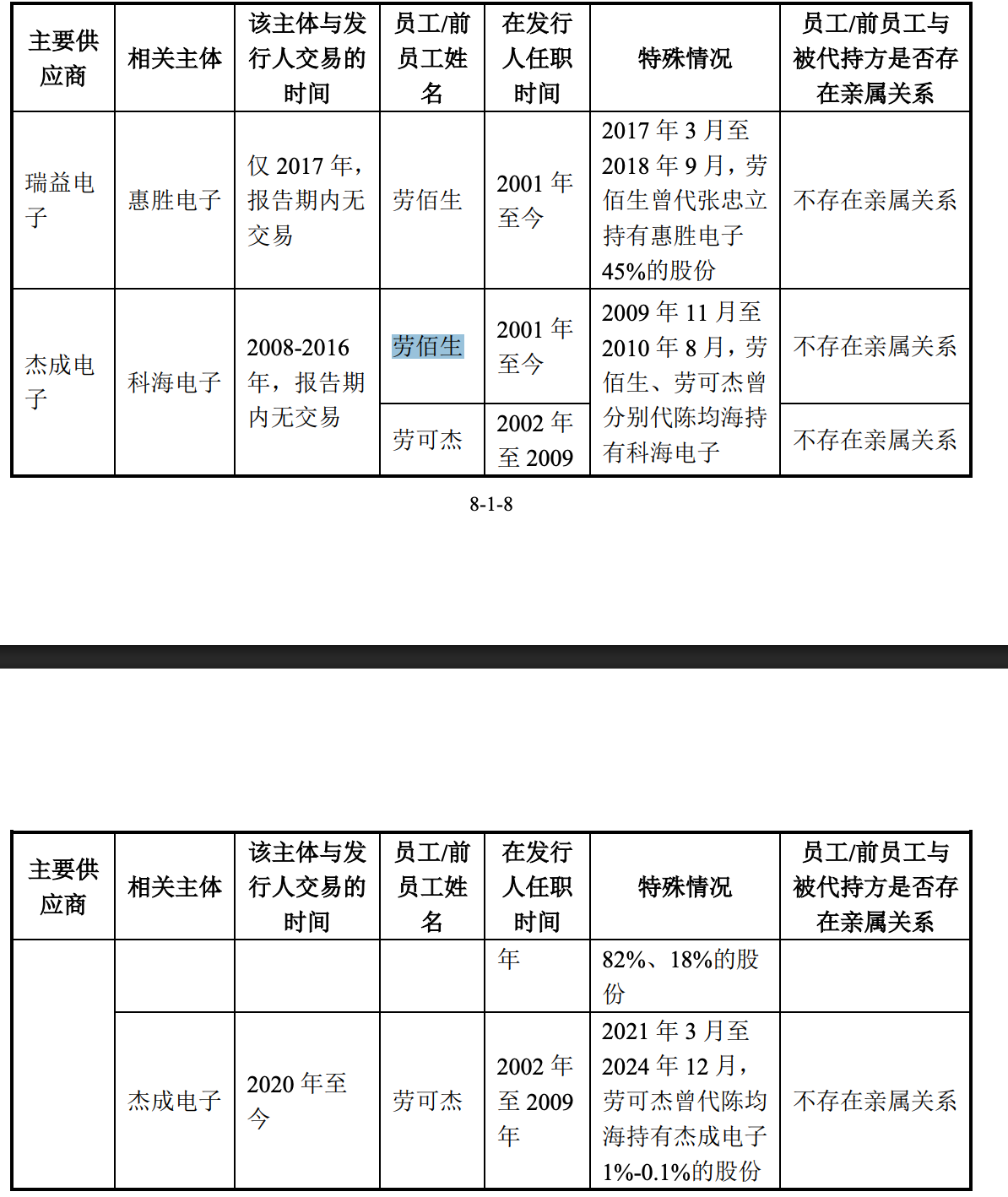 劳佰生现任公司生产制造中心副总监,同时是惠康科技间接股东,曾持有瑞益电子前身惠胜电子45%股份并担任法定代表人,而惠胜电子同时嵌入惠康科技与兴瑞科技的供应链体系。对此,惠康科技在最新回复中称,劳佰生的持股系为张忠立代持,属于“员工个人行为”,与公司无关。