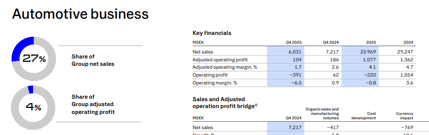 从最新财报数据来看,斯凯孚汽车板块压力进一步加大,2025年营收约为260亿瑞典克朗,同比下滑11%,且出现了2.2亿瑞典克朗的营业亏损,营业利润率为-0.8%。欧洲、北美传统车市需求疲软,是主要拖累因素。