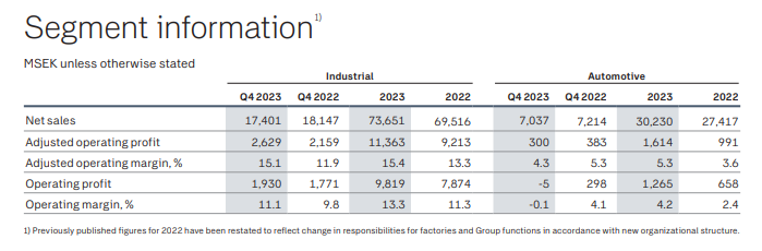 不过,斯凯孚的汽车板块长期面临一个重要问题——利润率显著偏低,远低于工业板块。自2010年以来,汽车板块的营业利润率未曾再次突破10%。以2023年为例,工业板块营收飙升至736.51亿瑞典克朗,占据集团总营收70%以上,营业利润接近100亿瑞典克朗,营业利润率13.3%。相比之下,这一年,汽车板块营收为302.3亿瑞典克朗,营业利润12.65亿瑞典克朗,营业利润率仅4.2%,远低于工业板块。