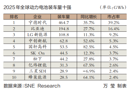 从市场结构来看,头部企业集中度进一步提升,2025年1全球动力电池十强企业合计市场份额提升至89.5%,占比近9成,行业马太效应愈发显著。