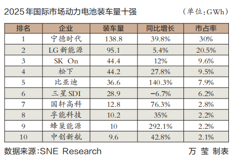 根据SNE Research的数据,2025年,除中国以外的国际市场动力电池装车量达到463GWh,同比增长26%。2025年,国际市场动力电池装车量十强同样有6家中国车企入围,而2024年为4家。其中,宁德时代稳居第一,比亚迪升至第五,国轩高科取代特斯拉成为榜单第七,蜂巢能源取代PPES跻身榜单第九;孚能科技、中创新航排名保持不变,分别位列榜单第八、第十。