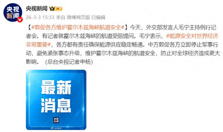 据央视新闻:今天,外交部发言人毛宁主持例行记者会。有记者就霍尔木兹海峡的航道受阻提问。毛宁表示,能源安全对世界经济非常重要,各方都有责任确保能源供应稳定畅通。中方敦促各方立即停止军事行动,避免紧张事态升级,维护霍尔木兹海峡的航道安全,防止对全球经济造成更大影响。