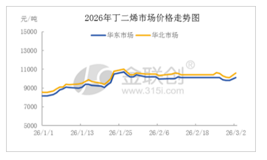 2 月 28 日市场迎来趋势反转:受美伊战事冲突,大宗商品及下游合成橡胶期货大幅上行,持货商捂盘惜售,市场低价货源收紧。3月2日美伊冲突进一步激化,伊朗宣布关闭霍尔木兹海峡,市场看涨情绪集中释放,持货商报价大幅上调,下游基于后市供应担忧刚需跟进采购。截止3月2日,山东市场送到均价在10700元/吨,单日涨幅达4.39%。
