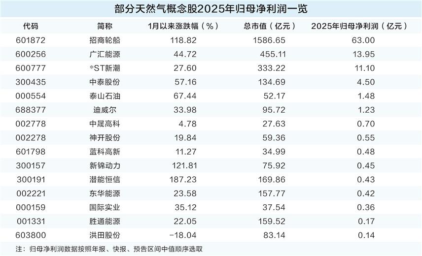 业绩方面,据证券时报·数据宝统计,截至3月3日,多只天然气概念股已经发布了2025年业绩相关报告。按年报、快报或预告中值统计,超过五成个股归母净利润规模在1000万元以上。