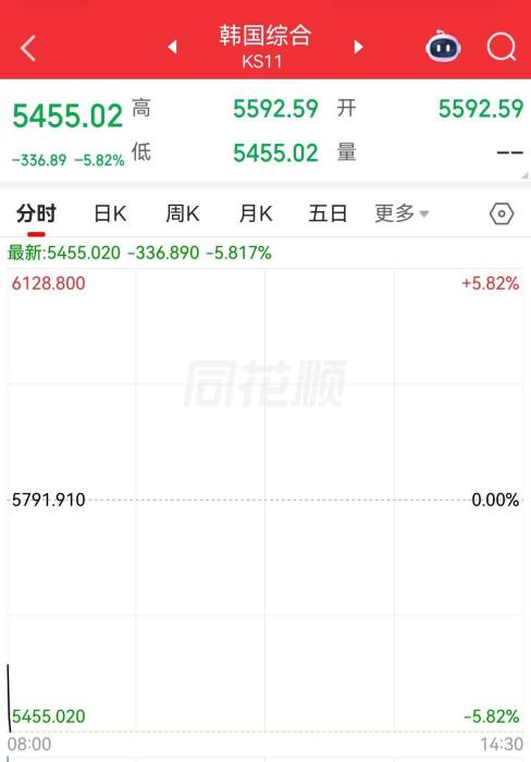 韩国综合股价指数(KOSPI)开盘下跌3.44%,此后跌幅一度扩大至6%;韩国创业板科斯达克指数(KOSDAQ)下跌2.25%。