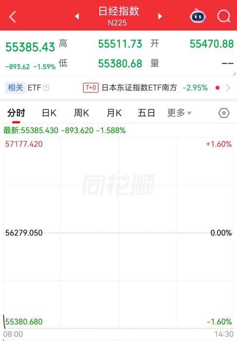 日经225指数低开1.4%,开盘后继续走跌,向下跌破55000点。