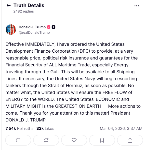 当天,特朗普在其社交媒体平台Truth Social上发帖称,已指示美国国际开发金融公司(DFC)以非常合理的价格提供政治风险保险和保证,以确保所有海上贸易的金融安全,特别是通过海湾的能源贸易。如有必要,美国海军将尽快开始护送油轮通过霍尔木兹海峡。