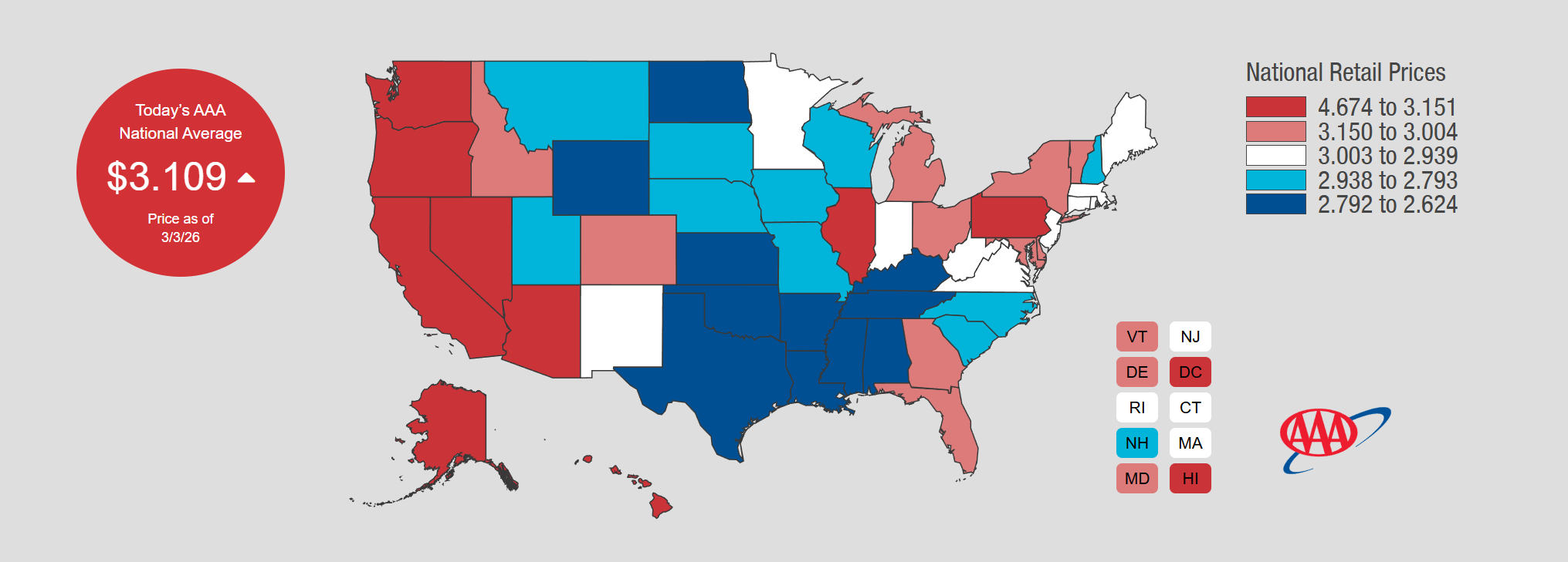 根据美国汽车协会(AAA)的数据,过去24小时内,全国加油站的平均油价上涨了0.10美元,达到每加仑近3.11美元。