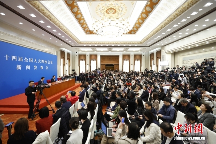3月4日,十四届全国人大四次会议在北京人民大会堂举行新闻发布会。大会发言人娄勤俭就大会议程和人大工作相关问题回答中外记者提问。中新社记者 韩海丹 摄