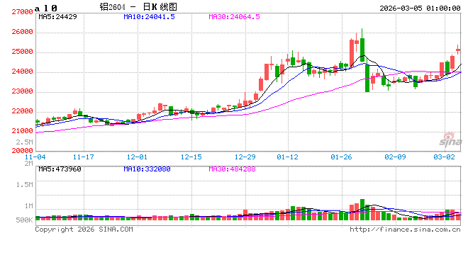 3月4日,LME铝主力合约盘中最大涨幅达4.37%,触及3418美元/吨。3月4日夜盘,沪铝主力合约盘中一度上涨3.61%,触及25380元/吨高位。分析人士认为,中东目前局势下,电解铝生产所需电力面临断供风险,原料及成品运输也会受扰,铝价中枢仍有上行可能。
