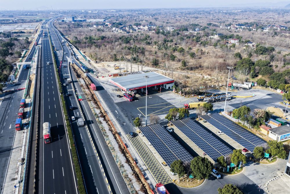 2026年1月7日拍摄的G50沪渝高速长兴服务区(无人机照片)。太阳能光伏板下是升级完成的高速服务区充电站。新华社记者 徐昱 摄
