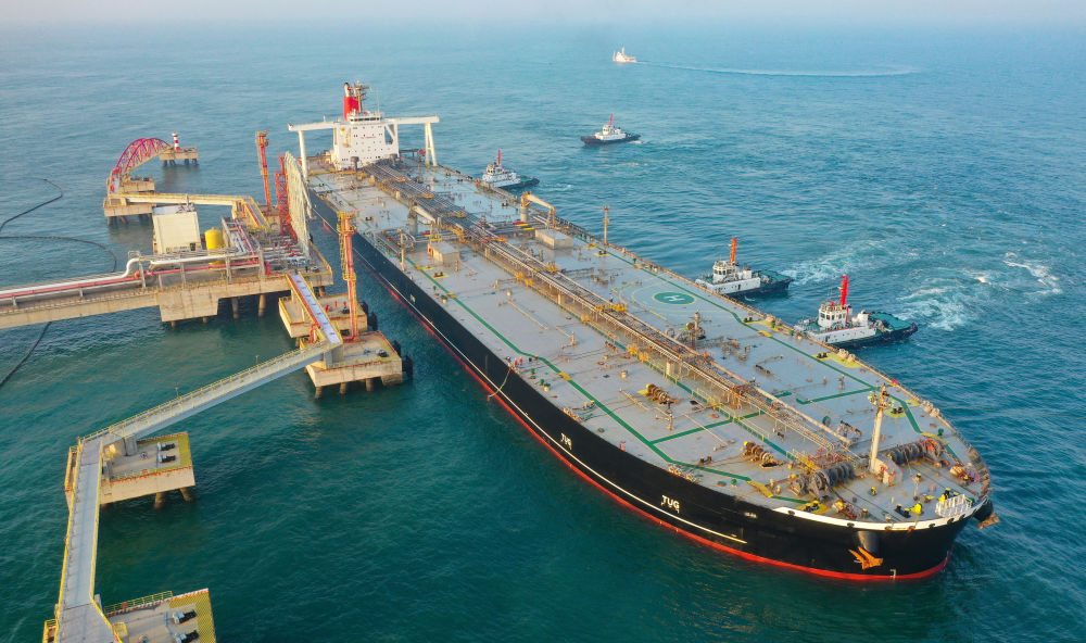 2025年12月18日,一艘装载着石化原辅料的外籍船舶泊入位于海南省儋州市的国投洋浦油储码头30万吨级原油泊位(无人机照片)。自2025年12月18日起,海南自由贸易港正式启动全岛封关。新华社记者 郭程 摄