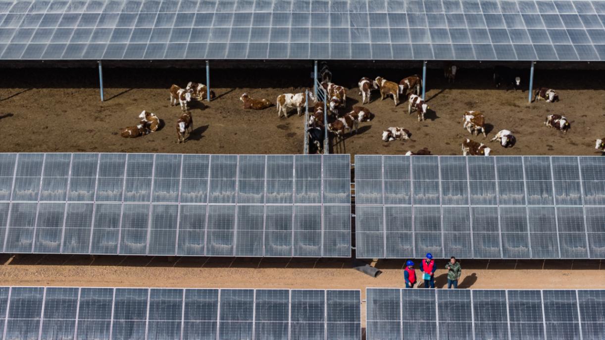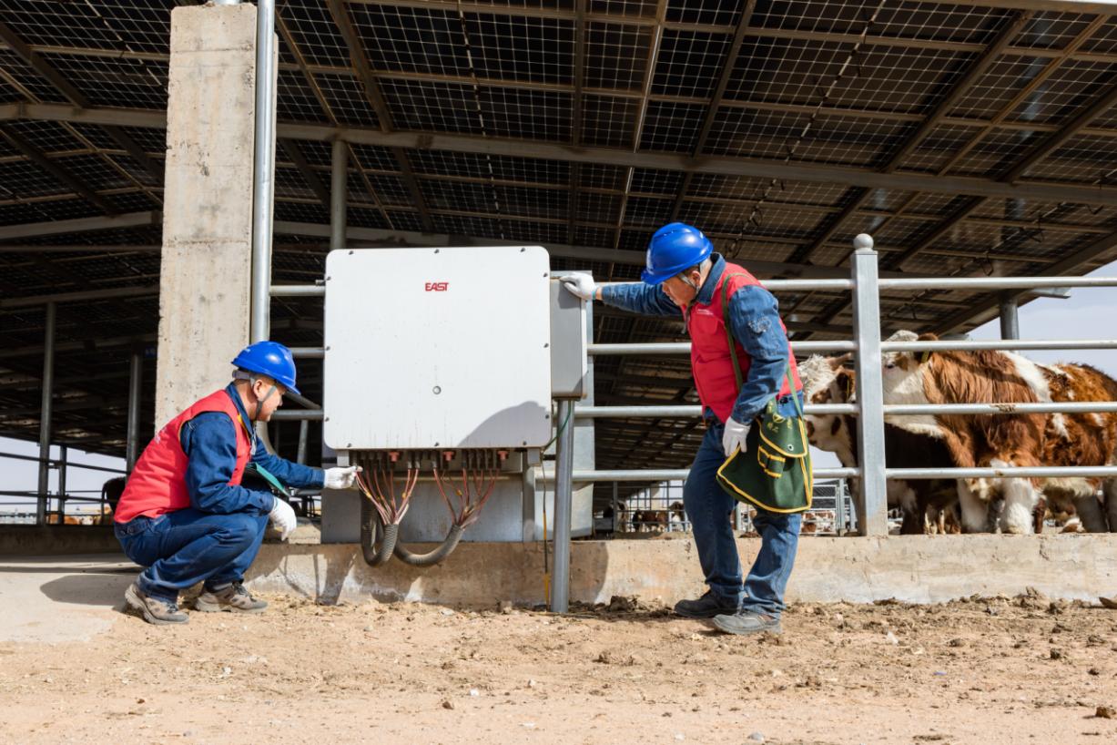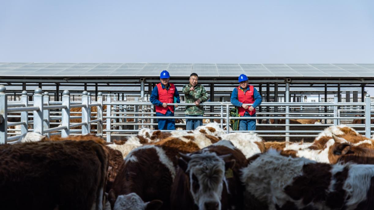 在养殖场运维人员的陪同下,沈奇和同事梁兴光开始了当天的专项巡检。抬眼望去,一排排整齐的牛舍上方,蓝色的光伏板在阳光下熠熠生辉。棚下,数千头肉牛悠闲进食;棚上,清洁电能正源源不断地并入电网。这天,他们再次来到这里,为这片“牧光互补”的绿色养殖基地筑牢电力保障。