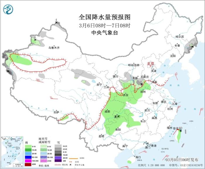 3月6日08时至7日08时,黑龙江东南部、吉林东部、新疆西部和北部山区、青海北部、甘肃河西、陕西北部、山西中南部等地部分地区有小到中雪或雨夹雪,其中,吉林东部、新疆南疆西部山区、山西东南部等地等地局地有大到暴雪(10~18毫米)。新疆南疆盆地西部、西北地区东南部、西南地区东部、黄淮西部、台湾岛东部等地部分地区有小到中雨,局地有大到暴雨(50~60毫米)。西藏北部部分地区有6~7级风,台湾海峡、台湾以东洋面、东海南部、南海东北部等部分海域将有6~8级风、阵风9~10级。