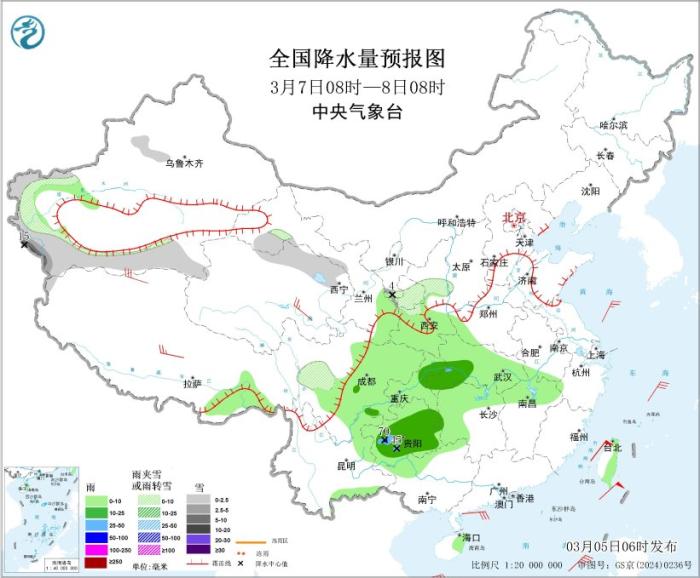 5日至7日,西南地区东部、西北地区东南部、江汉等地有小雨或雨夹雪,部分地区有中雨,其中,贵州西南部等地局地有大到暴雨。