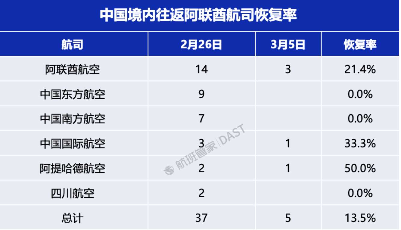 不过,随着阿联酋等国家的领空逐步开放,在安全评估基础上,国内航司已开始陆续恢复部分到中东的航班,但目前的恢复率还不高。