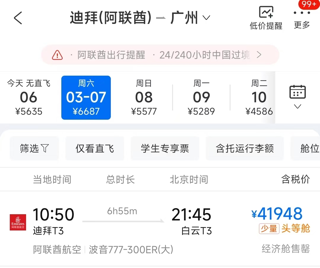 据记者从多家航司了解到的消息,目前飞往中东的航班上最多只有三四十人,主要是长期生活工作在中东地区的,而回国航班则基本满员,目前看未来几天的机票依然难抢,如迪拜-广州只有动辄4万多元的头等舱,很多已恢复的航线则在OTA上看不到售票。