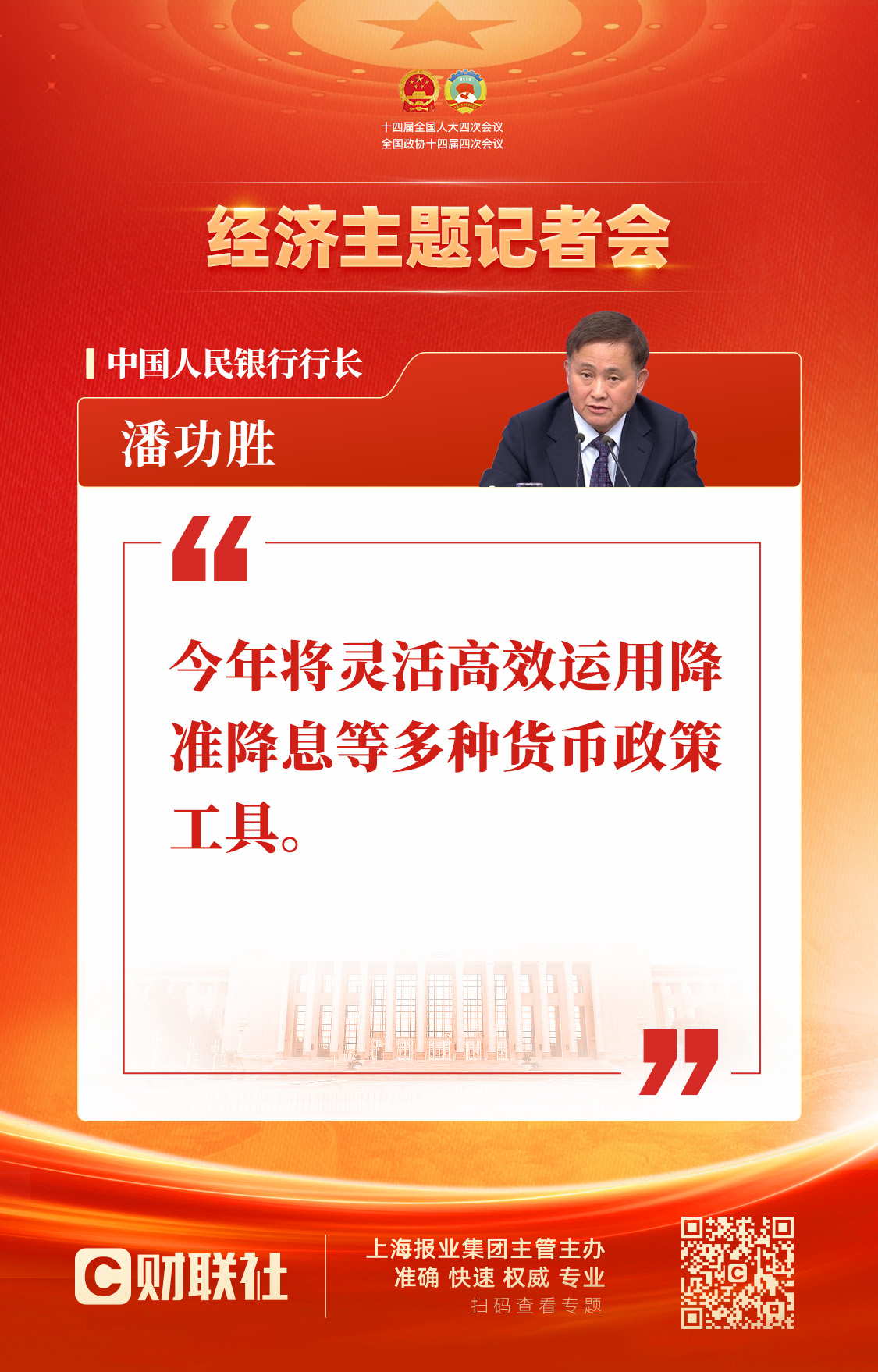 潘功胜表示,今年将灵活高效运用降准降息等多种货币政策工具。