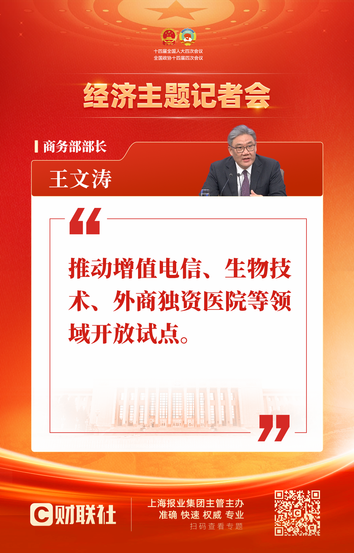 王文涛表示,在服务消费领域,我们要推动对外开放和对内放开。以服务业为重点,扩大市场准入,推动增值电信、生物技术、外商独资医院等领域开放试点,清理国内服务领域的不合理限制措施,扩大优质服务供给。