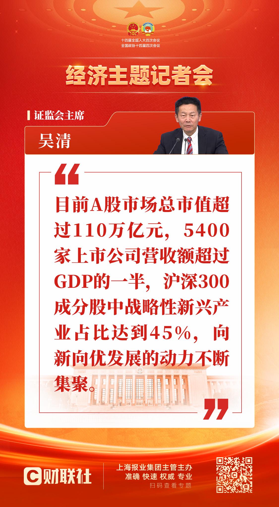 证监会主席吴清在记者会上表示,目前A股总市值超过110万亿元,5400家上市公司营收额超过GDP的一半,沪深300成份股中战略性新兴产业占比达到45%,向新向优发展的动力不断集聚。