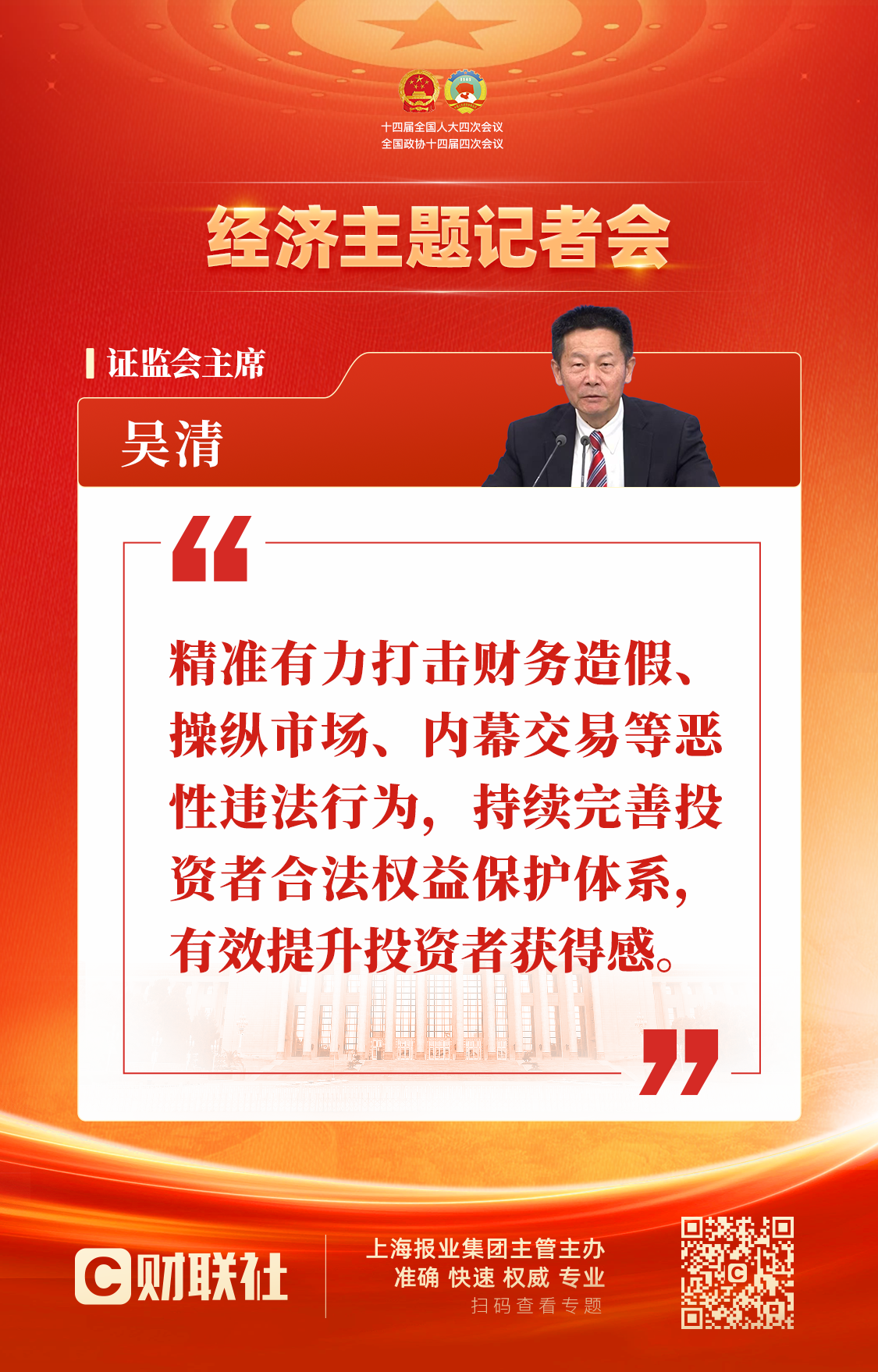 吴清表示,精准有力打击财务造假、操纵市场、内幕交易等恶性违法行为,持续完善投资者合法权益保护体系,有效提升投资者获得感。