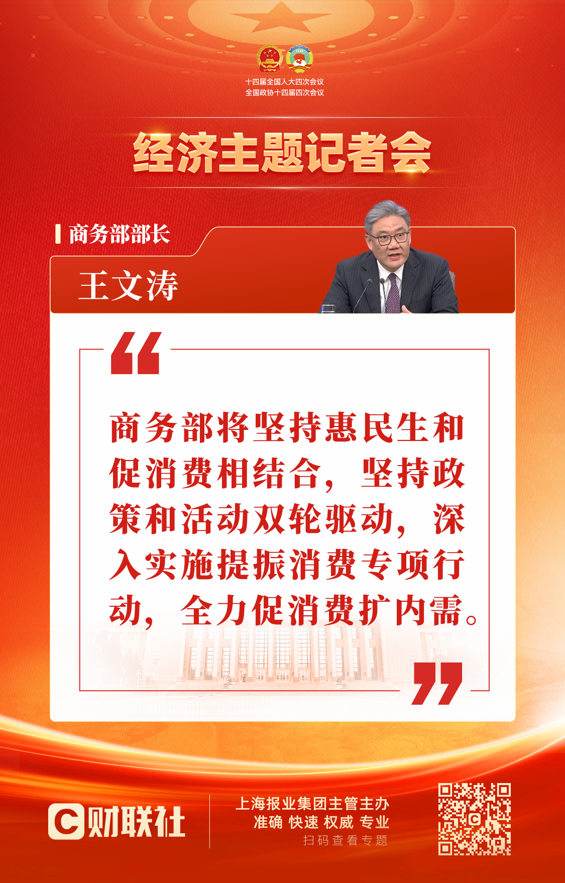 王文涛表示,商务部将坚持惠民生和促消费相结合,坚持政策和活动双轮驱动,深入实施提振消费专项行动,全力促消费扩内需。