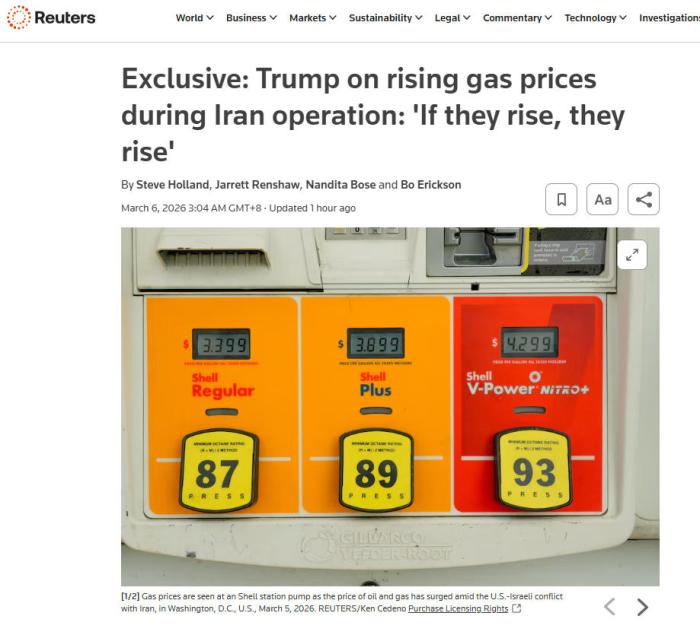 据路透社报道,美国总统特朗普5日接受该媒体采访时表示,他并不担心伊朗冲突升级导致美国汽油价格上涨,美国的军事行动才是他的首要任务。