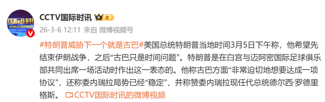 据CCTV国际时讯,当地时间3月5日下午在白宫与迈阿密国际足球俱乐部共同出席一场活动时,美国总统特朗普称,他希望先结束伊朗战争,之后“古巴只是时间问题”。
