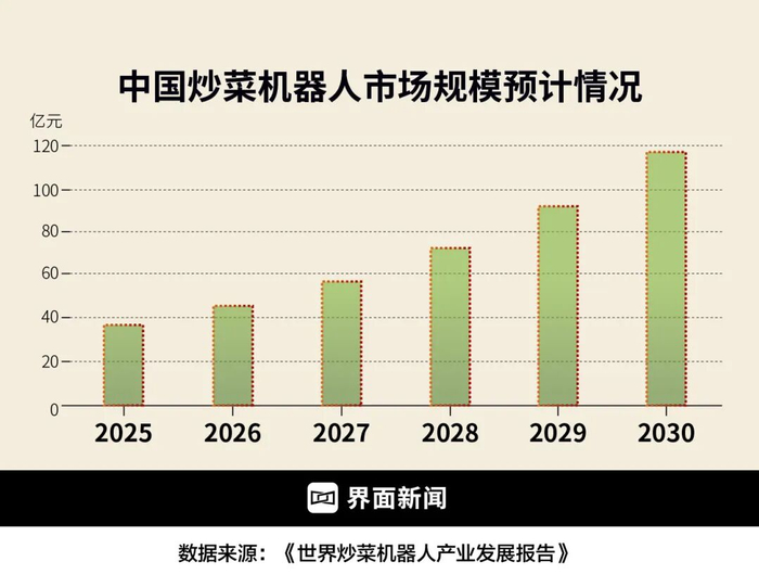 《世界炒菜机器人产业发展报告》显示,中国炒菜机器人在2025年的市场规模有望突破37亿元,随后一路增长,2030年预计将突破117亿元。