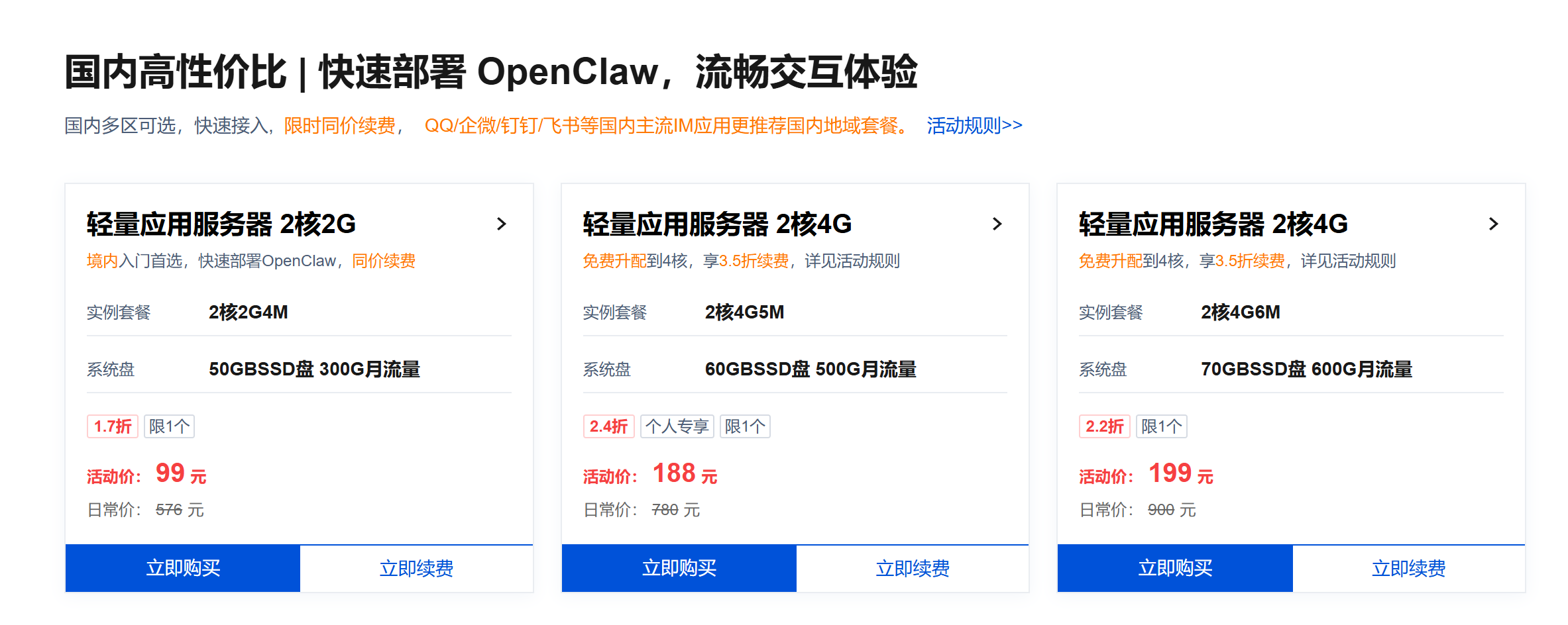 需要注意的是,尽管OpenClaw 的安装环节免费,但其运行所需的云端服务器则需要付费。《科创板日报》记者在其官网查询到,2核2G的轻量化服务器当前活动价为99元/年,2核4G版本则是188元/年起。
